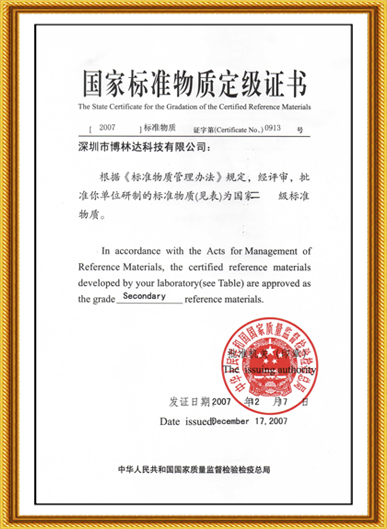 國家標(biāo)準(zhǔn)物質(zhì)定級證書(2007年)