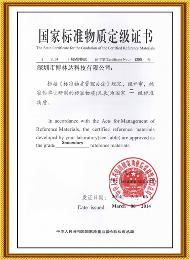 國家標(biāo)準(zhǔn)物質(zhì)定級證書(2014年)